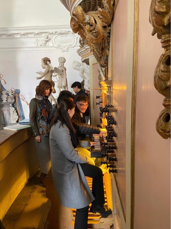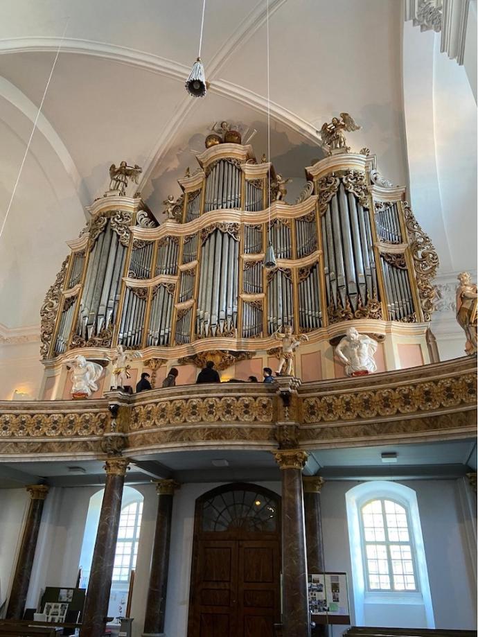 I had prepared a setting of Kauffmann’s Nun Freut euch, which specifies a Gedackt 8’ and Spillpfeife 4’ and it worked especially well on the flutes (Rohrflöte 8’ and Spitzflöte 4’) of the Oberwerk of the Treutmann organ. It was also helpful to hear from the professors about how a small change in tempo can change the mood of a piece very much. We were encouraged to refer to the manuscript of the Kauffmann pieces, as they had fewer inaccuracies than modern editions. This meant that we needed to be more flexible organists, reading different clefs and older notation.